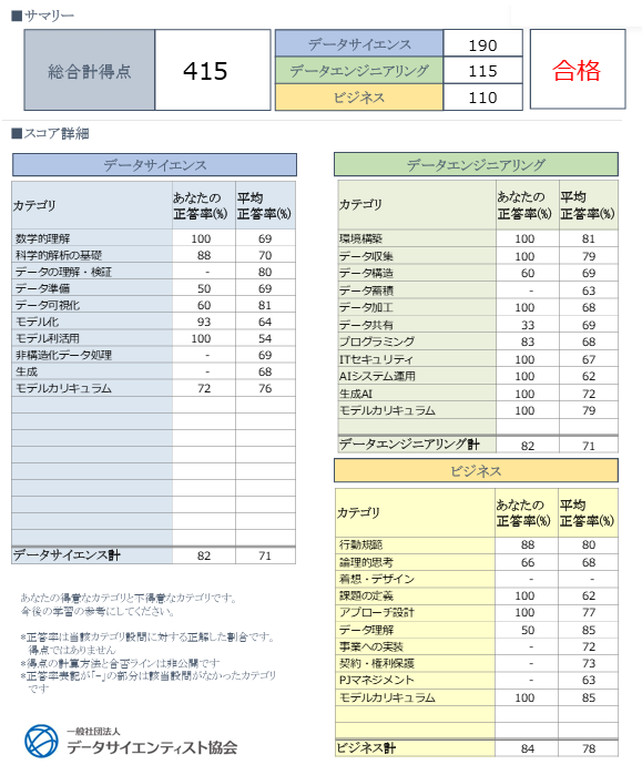 スコアシートは以下の通りでした。分野ごとで両極端って感じ。当日の速報通り83%の得点率ですね。